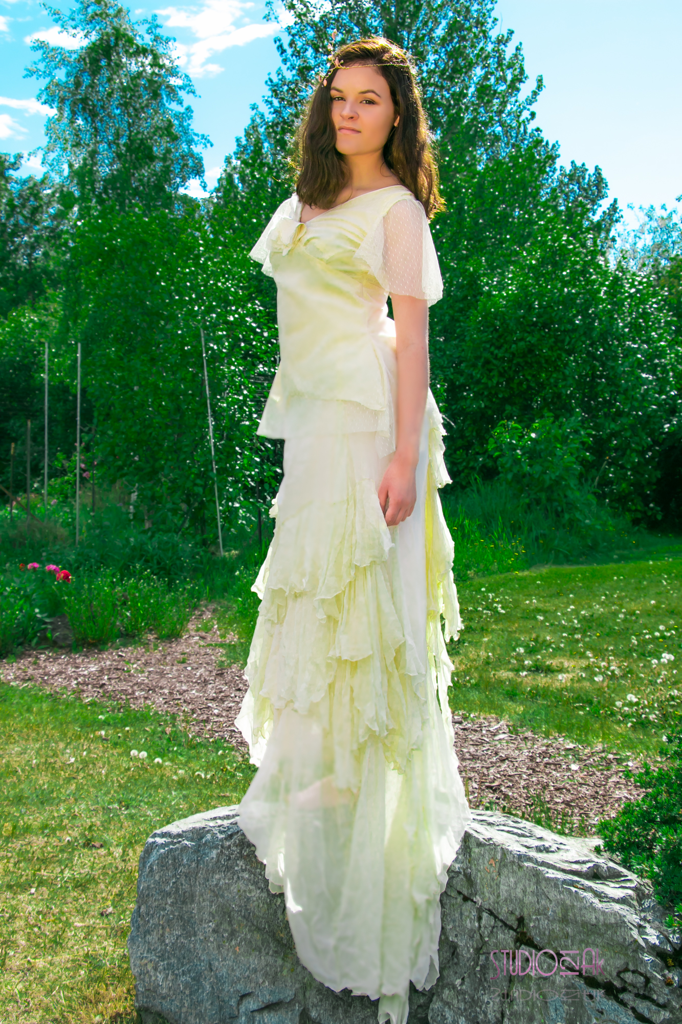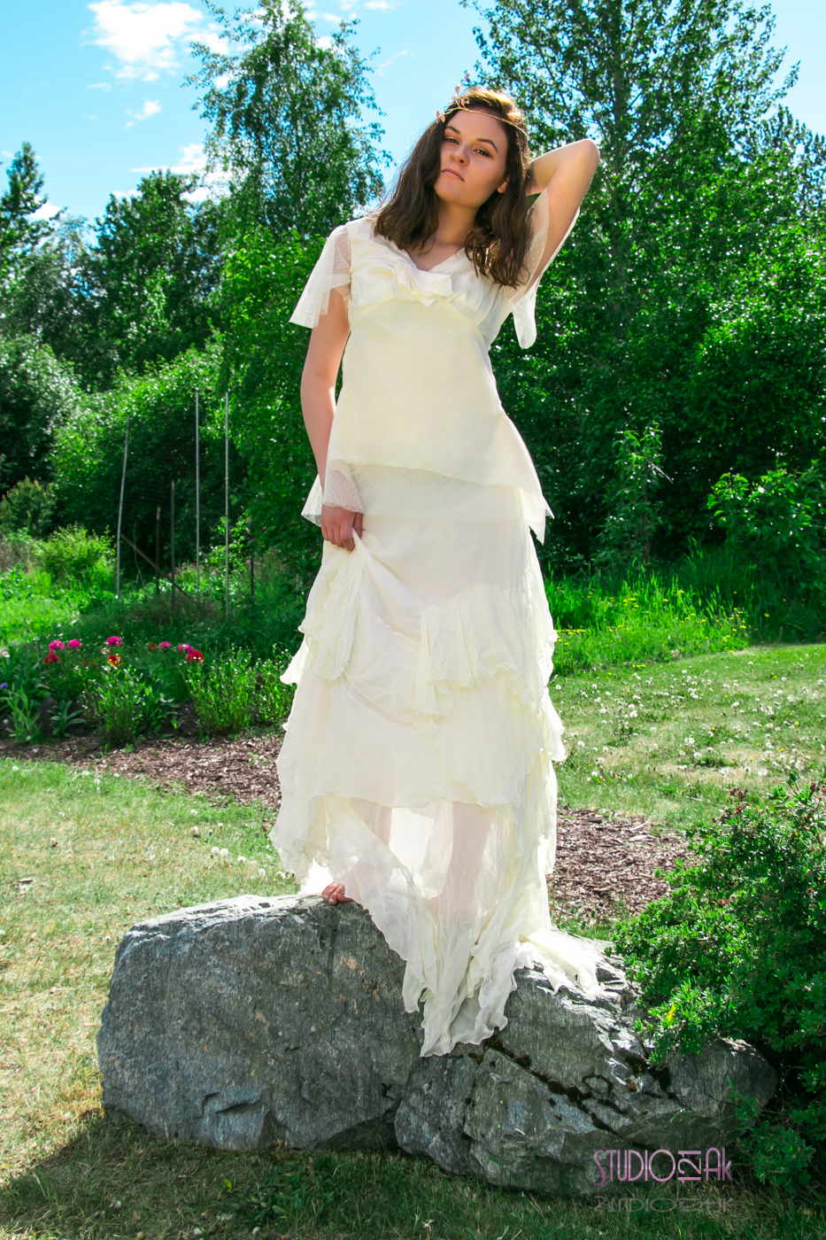 As billowy as clouds, this bridal skirt is made of flowing ruffles of fair trade silk chiffon and lined in soft habotai for a as light as air, ethereal look. The aline shape and duppioni waist band make for the flattering look. The chapel train trails with cascading ruffles behind you.