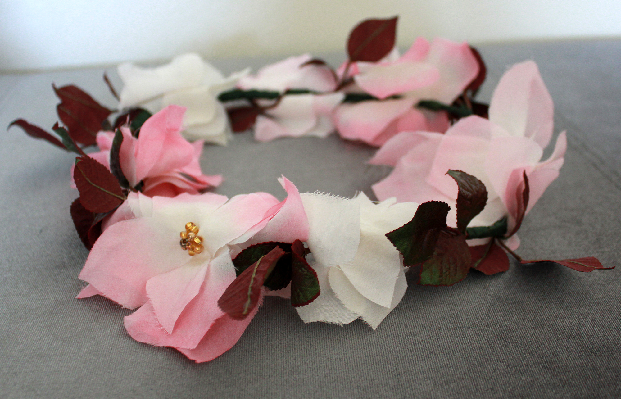 Hand-cut and hand-dyed wild rose flowers made of Fair Trade silk Habotai with glass beaded centers and vintage Japanese rose leaves adorn this bridal wreath. This floral crown is handmade in our studio and can be customized with your wedding colors and to match your favorite flowers.