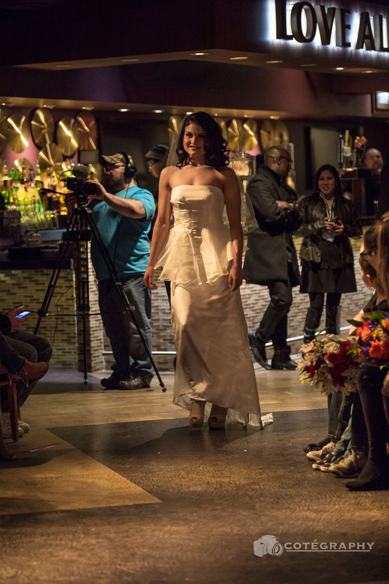 Our Daphne gown has a modern sensibility with a slightly A-line, column-style skirt, strapless, structured bodice and a clean look. The silk has a slight sheen to it almost like a matte satin and has lovely movement at the skirt. The hem and chapel-length train are hand-beaded. The look is completed with a silk organza detachable peplum that creates more of an hour-glass, curvy figure and finished with a rhinestone embellishment.