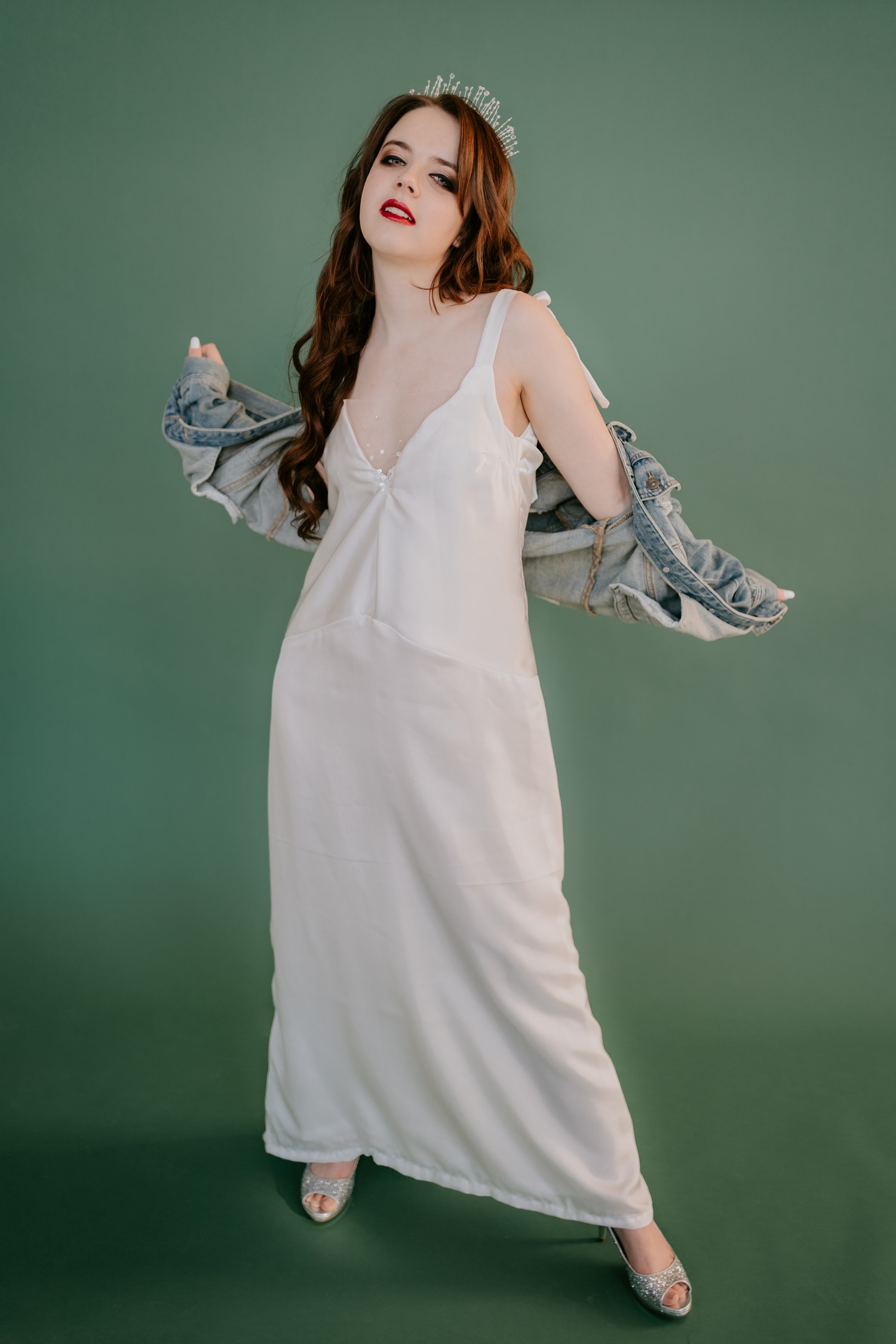 Our Celeste gown is made from fair-trade silk satin and silk habotai that has a feather-light feel and ethereal quality. Its slinky silhouette hugs your curves with a slight drop waist that is sexy and flattering. The strappy ties at back are fun and adjustable. The low-back style adds drama and the deep v front with sequin adorned illusion neckline adds sparkle and flair.