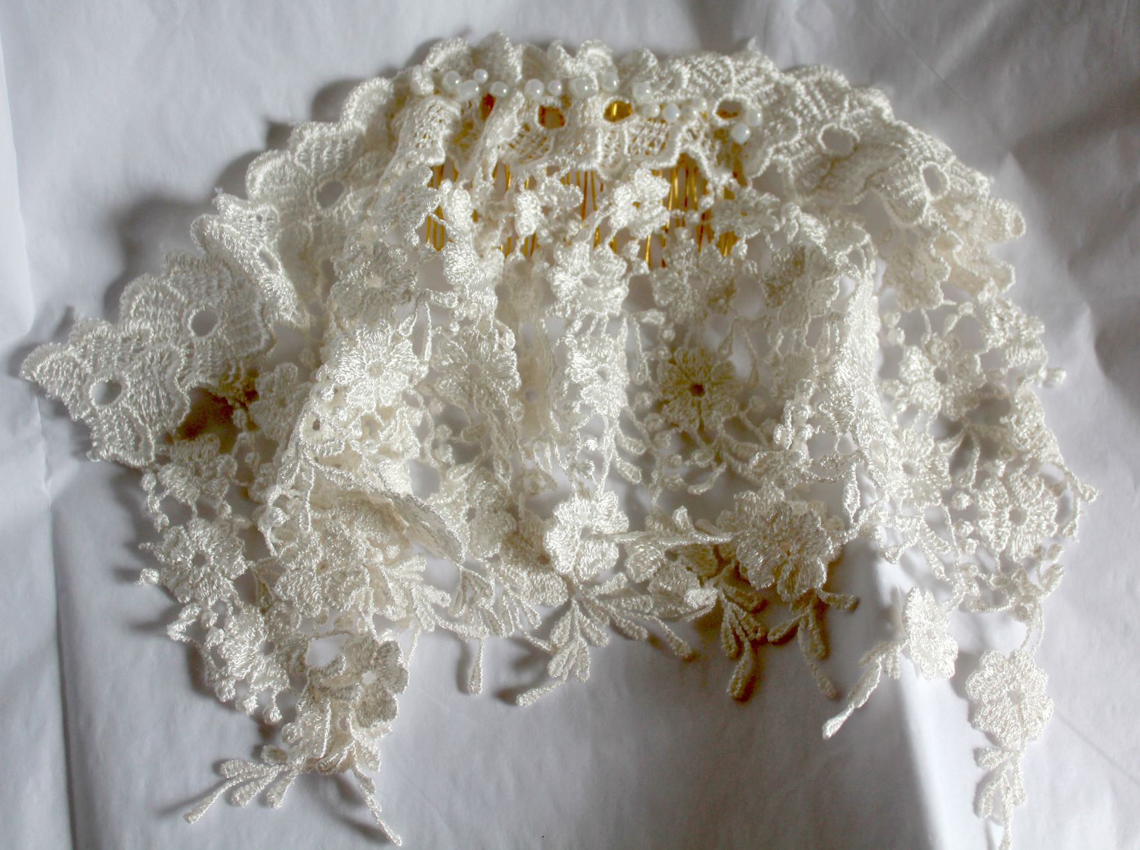 Bohemian bridal comb made of exquisite ivory Guipure lace. Perfect topper over your veil or worn alone. Lovely hanging floral lace adorned with iridescent beads and attached to a nickel-free gold comb for easy styling.