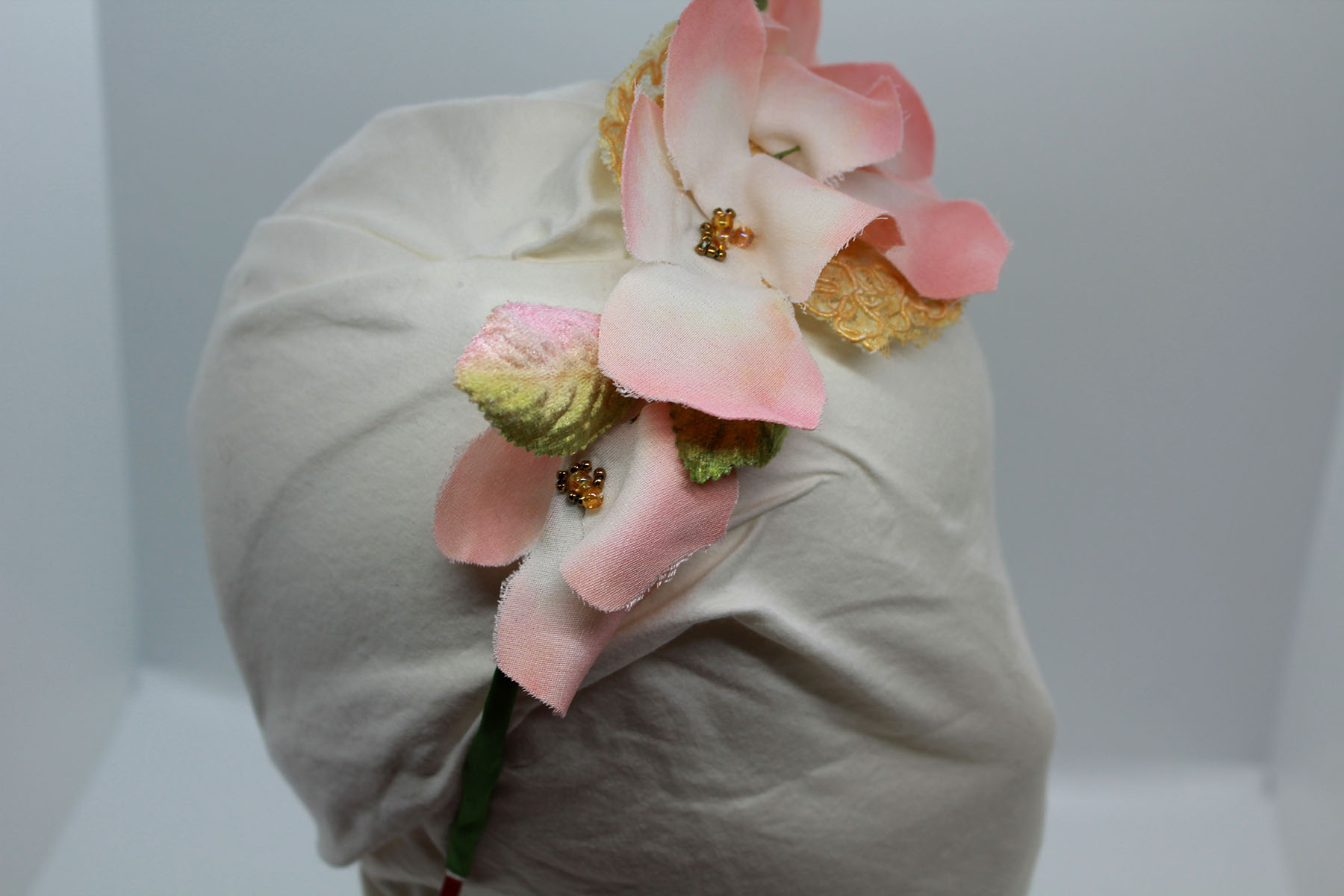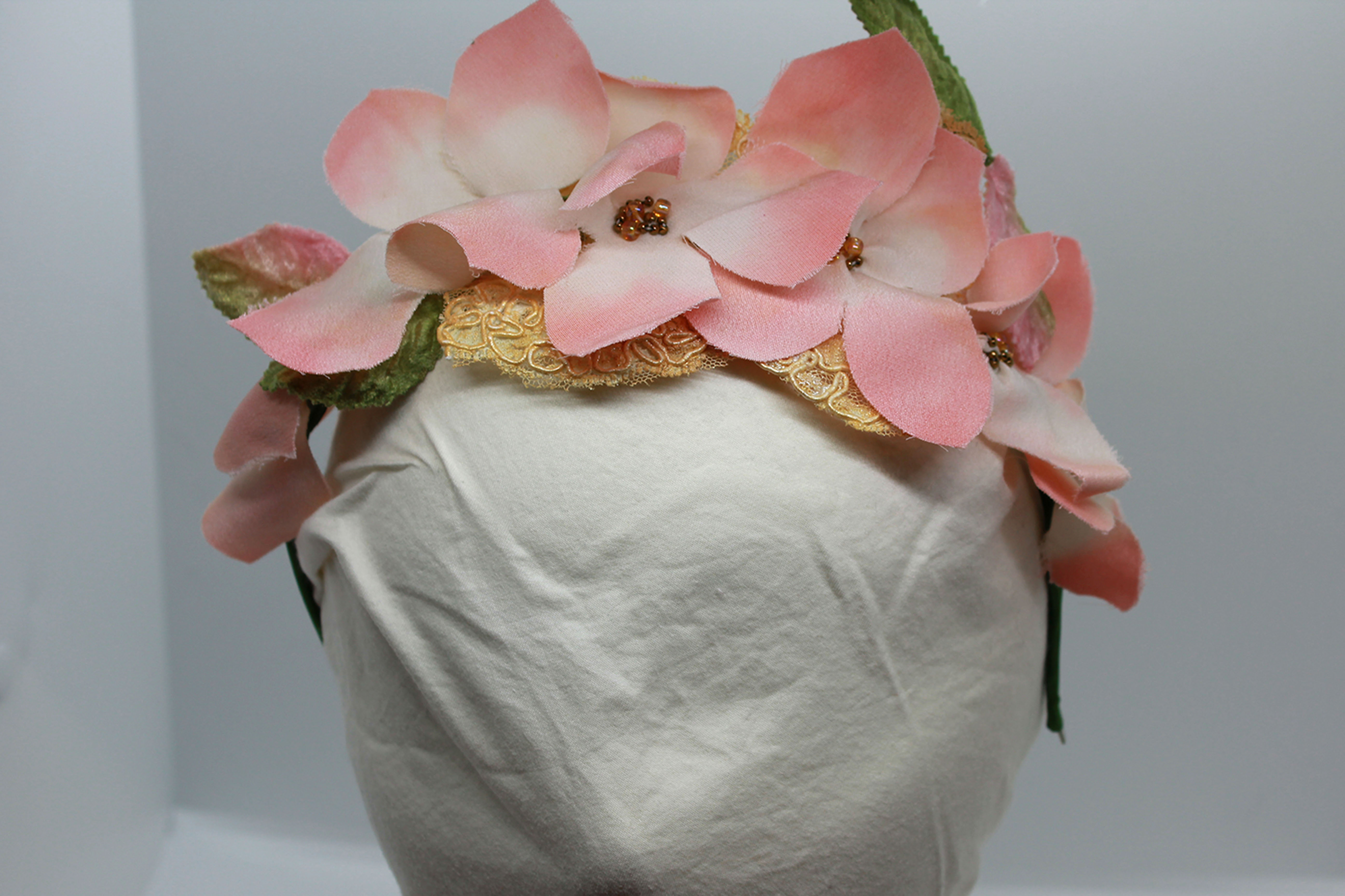 Like a woodland sprite, this hand-crafted wedding headband is bound to add a little rustic charm to your wedding day! Made of hand-crafted and hand-dyed silk flowers with beaded centers and vintage velvet green and pink leaves. This bridal headband is crafted to look like a sprig of dogwood leaves with a realistic appearance perfect for a spring or summer wedding. Affixed to a comfortable silver metal headband and adorned with green satin ribbon and a Alencon lace base.