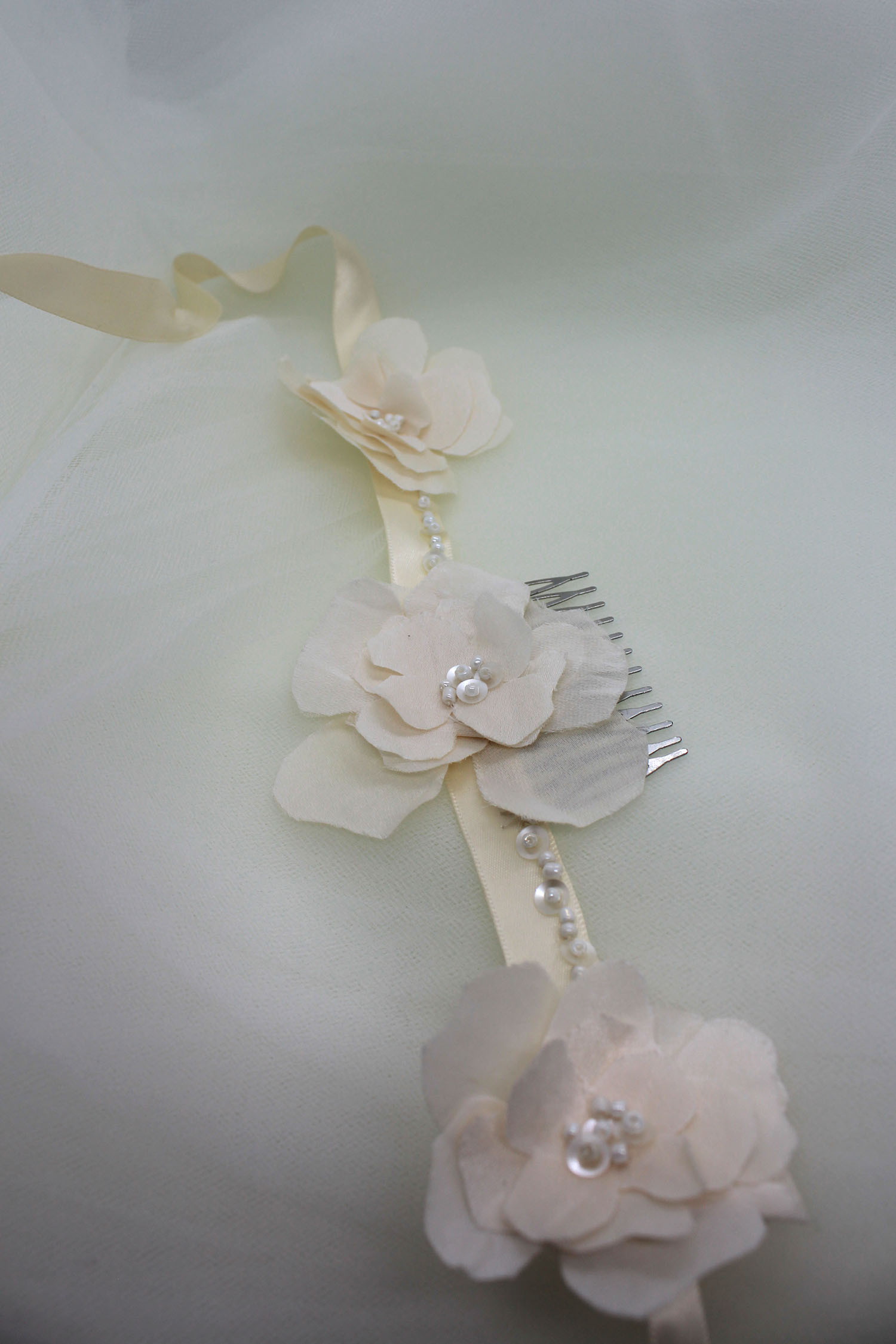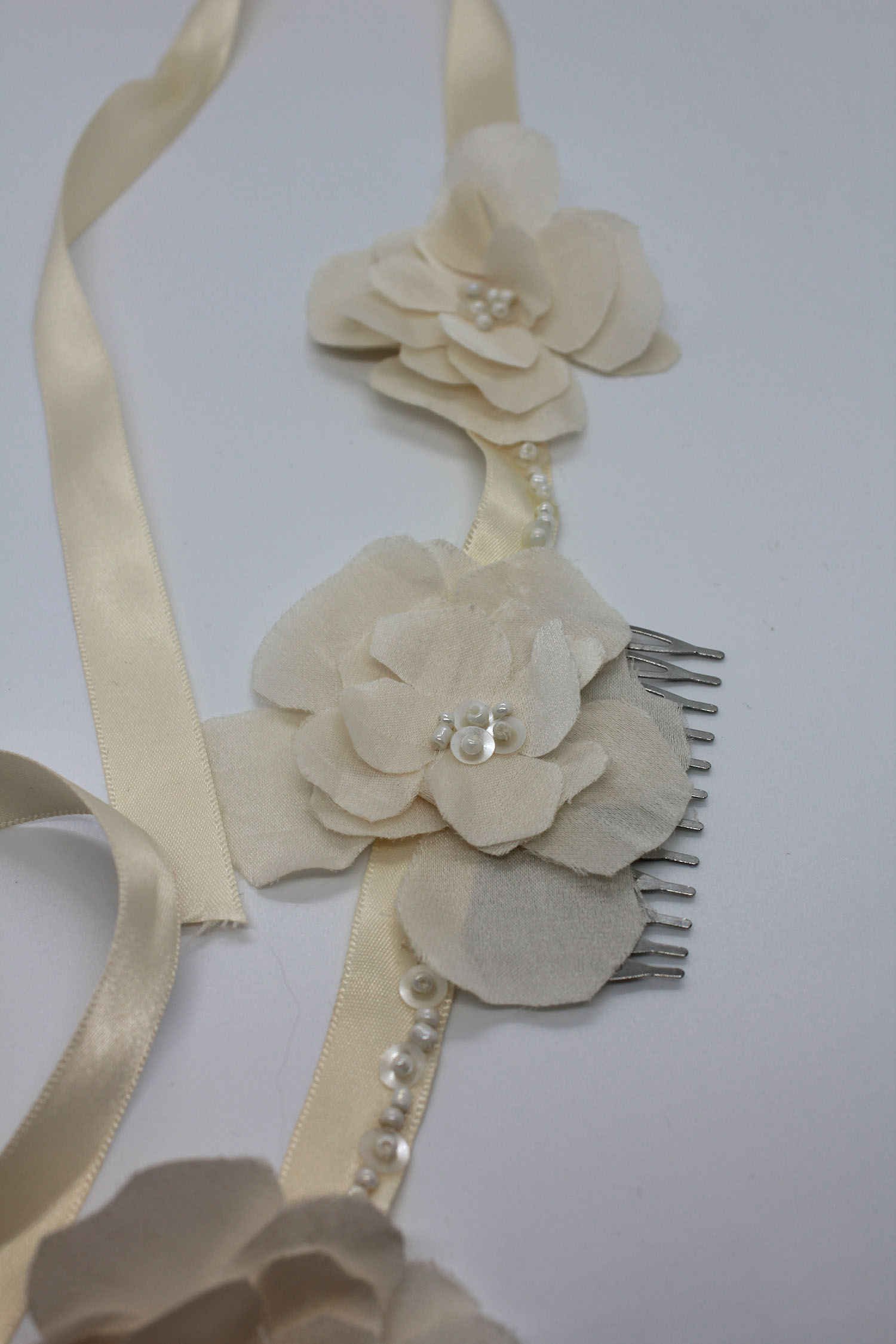 Beautifully crafted silk satin flowers adorned this beaded hair ribbon. Made of premium ivory bridal satin, these hair flowers have silver beaded centers that match the silver beading on the ribbon. Ribbon ties behind your head and has a comb behind the center flower for easy styling. Ribbon can be worn as shown or woven into a braid.