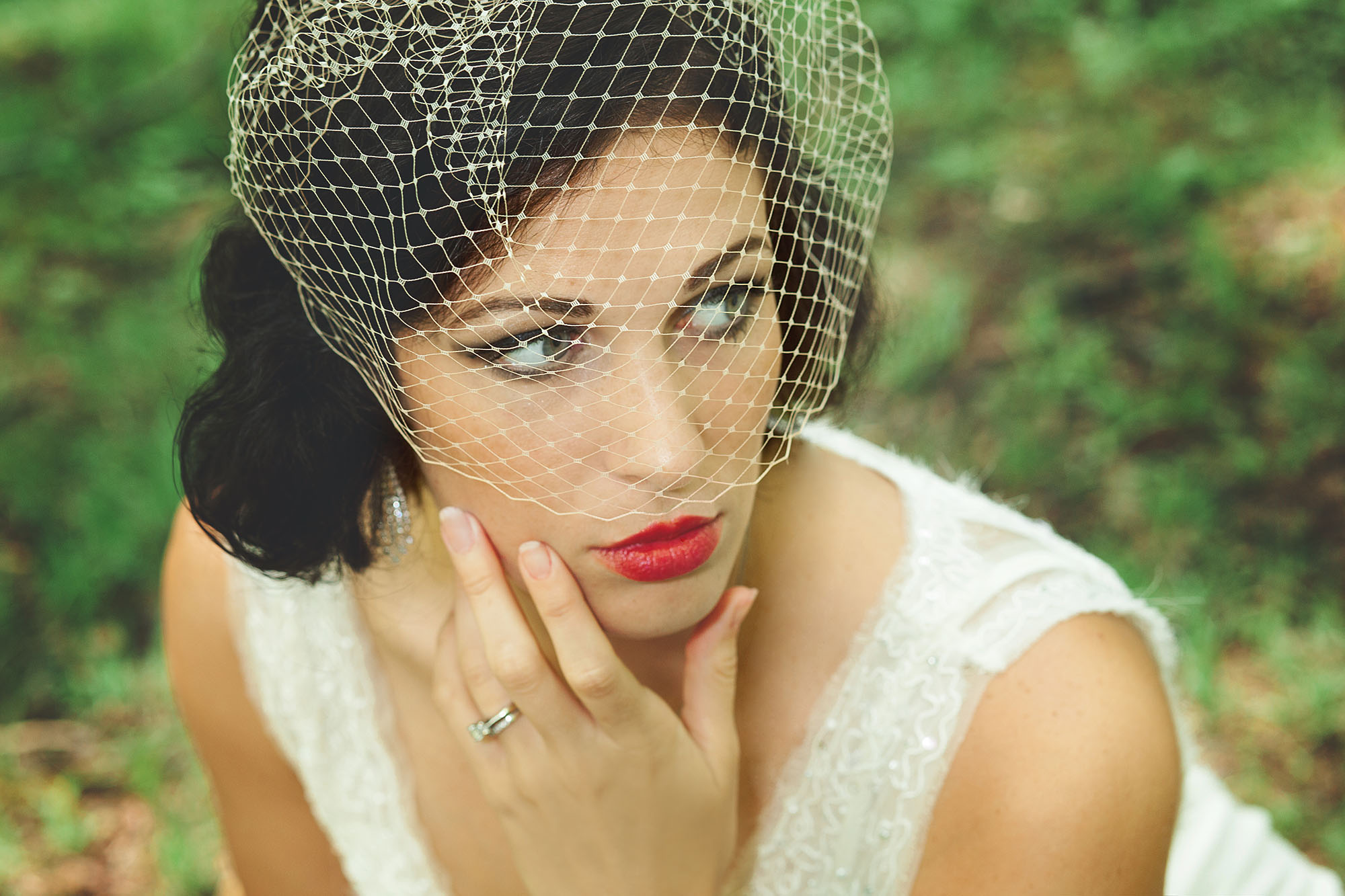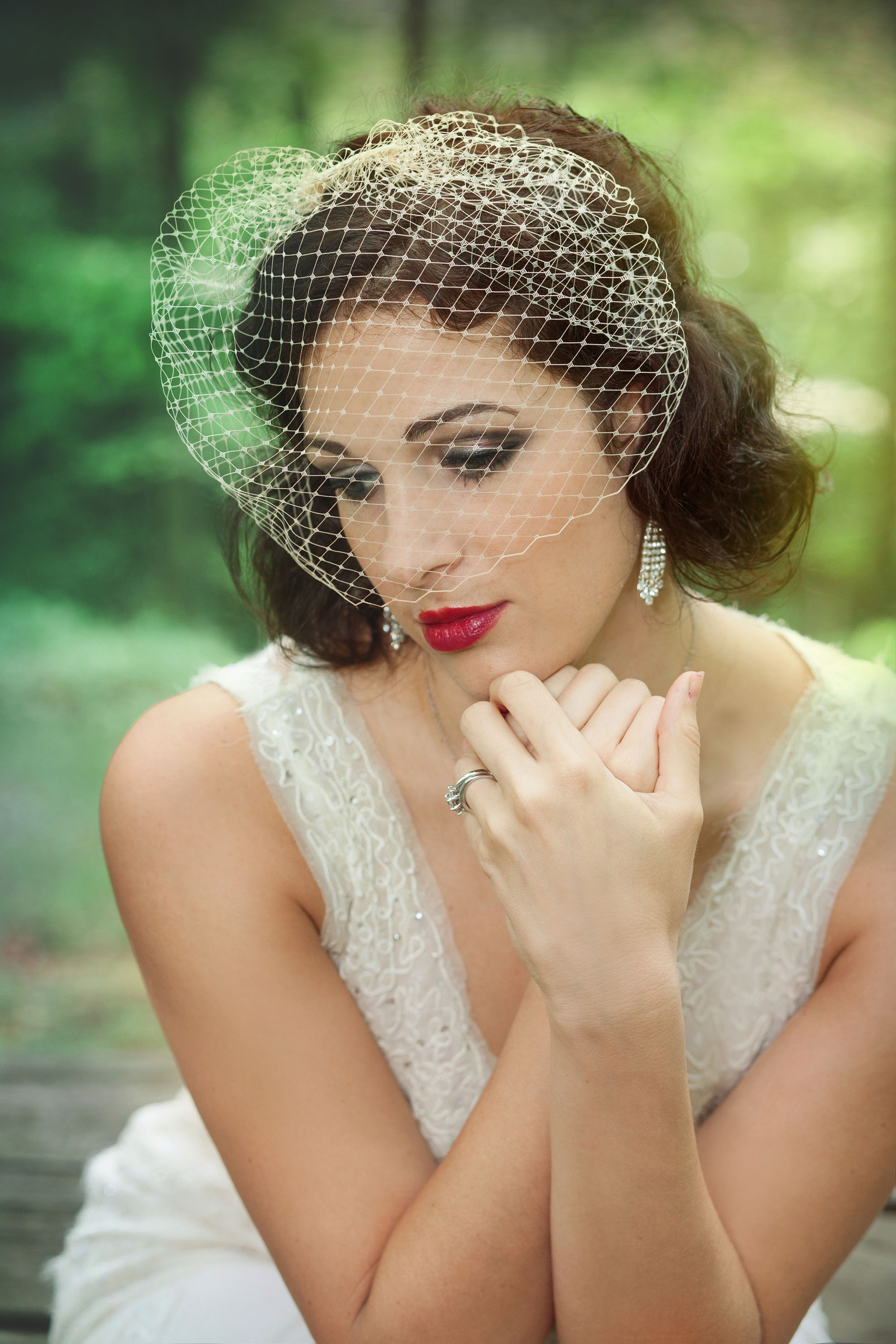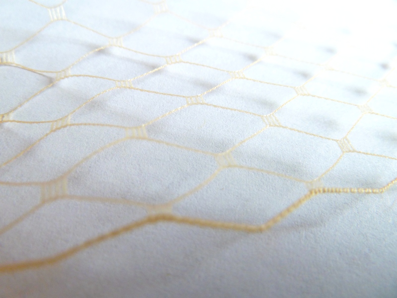 Lovely 9 inch birdcage veil in delicate French Net. The perfect weight and stiffness, it falls neatly and adds the right amount of volume. Available in white, ivory, diamond white (light ivory), champagne (shown) and black.