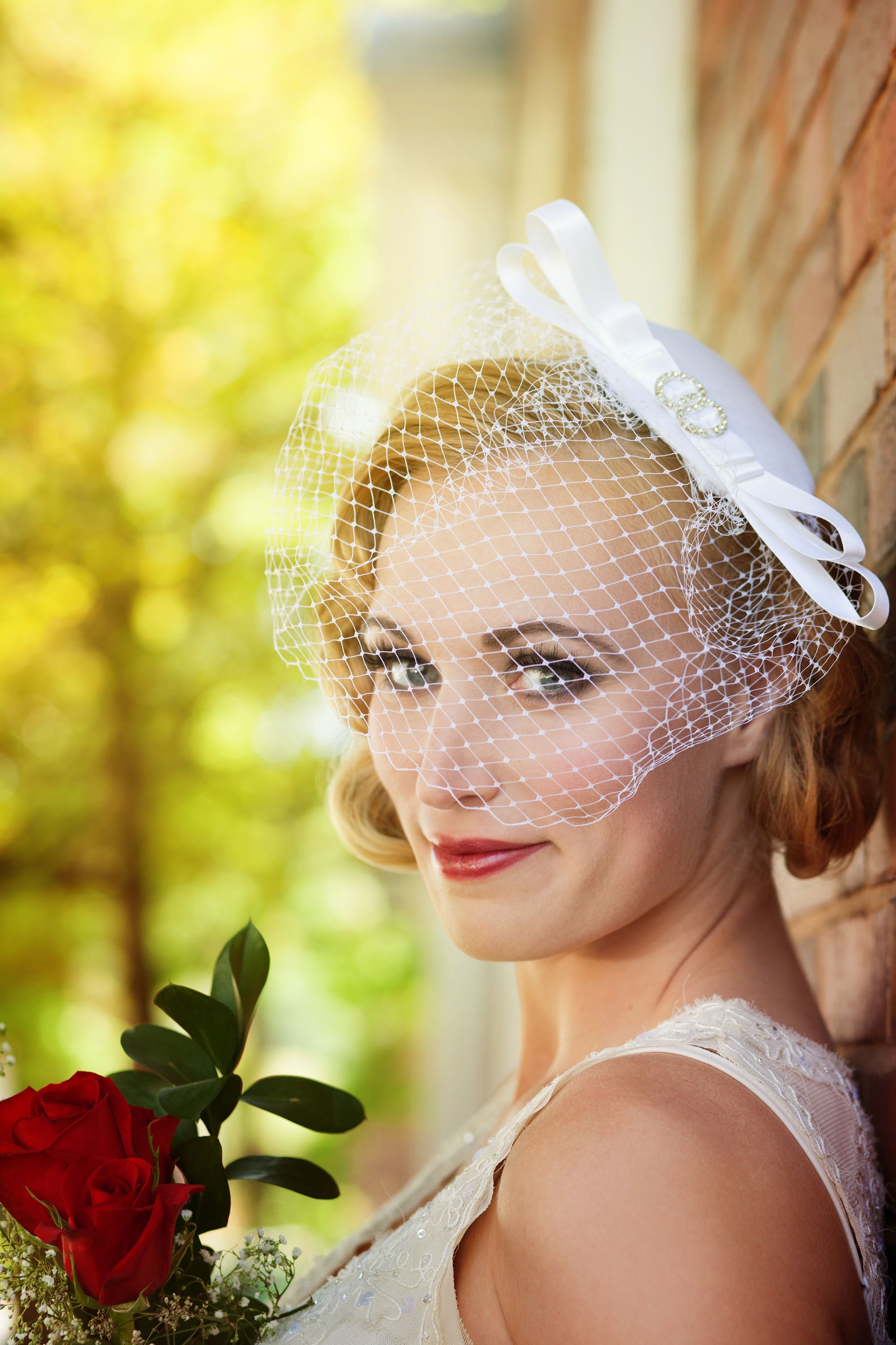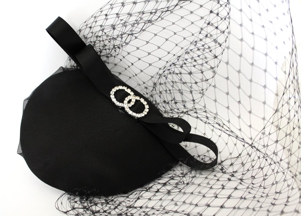 Gorgeous 1940s/1950s style teardrop hat covered in organza and embellished with ribbon and a rhinestone slider for sparkle. The attached veil is 9 inches of soft french net. So glamorous, the black version would be perfect for your bridesmaids to complete their vintage look, or stunning as a cocktail hat. The white version is a chic as a veil alternative on your big day.