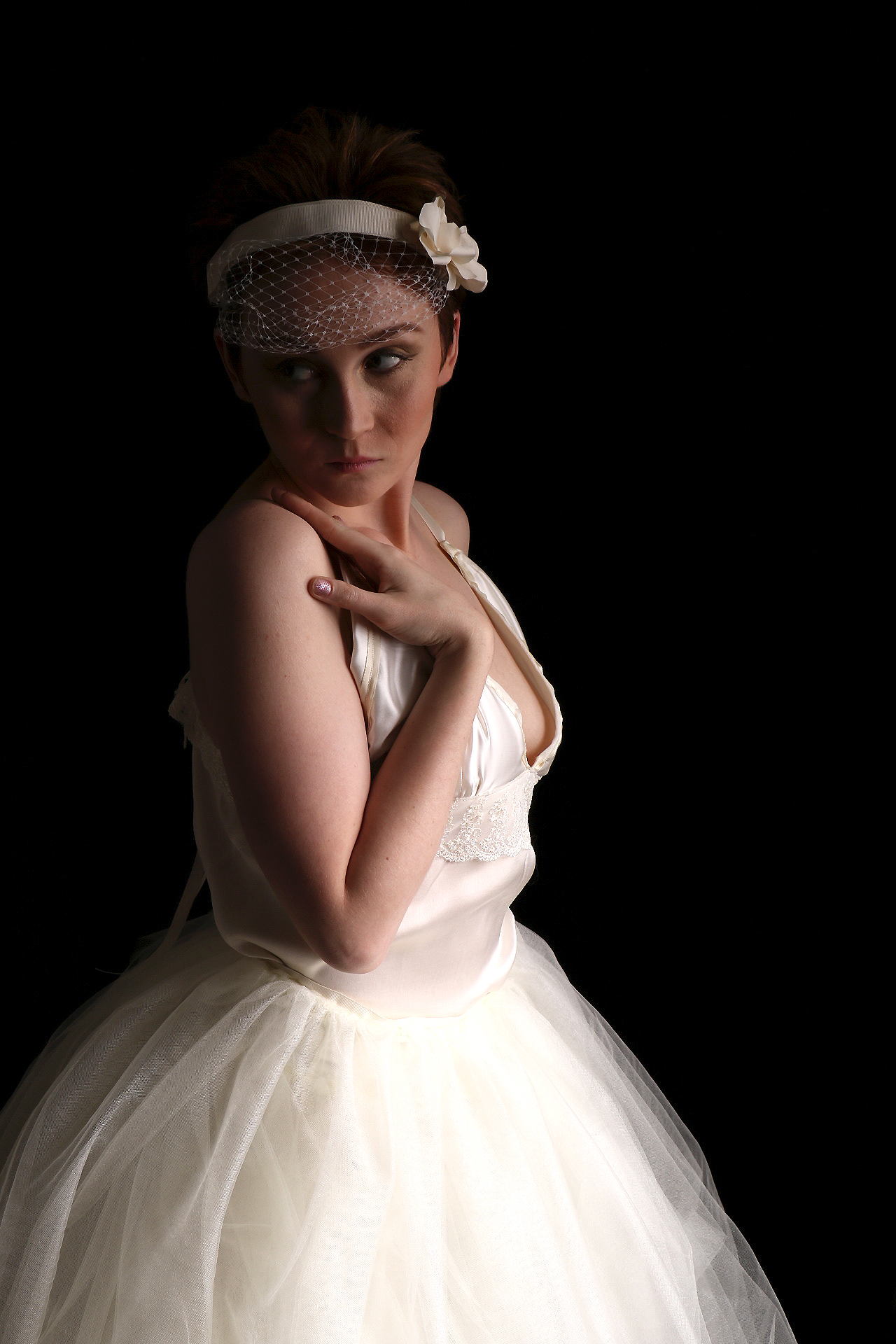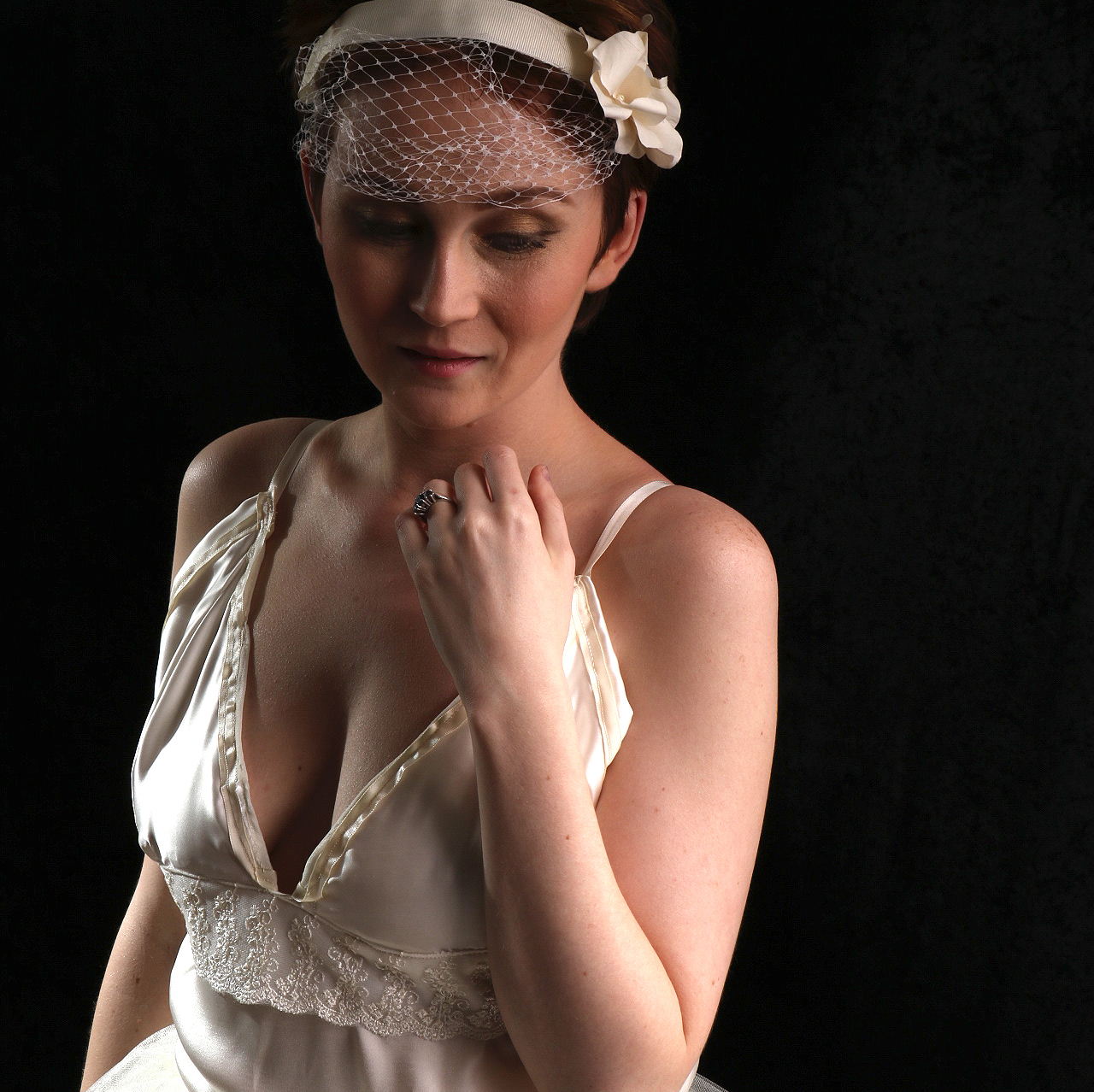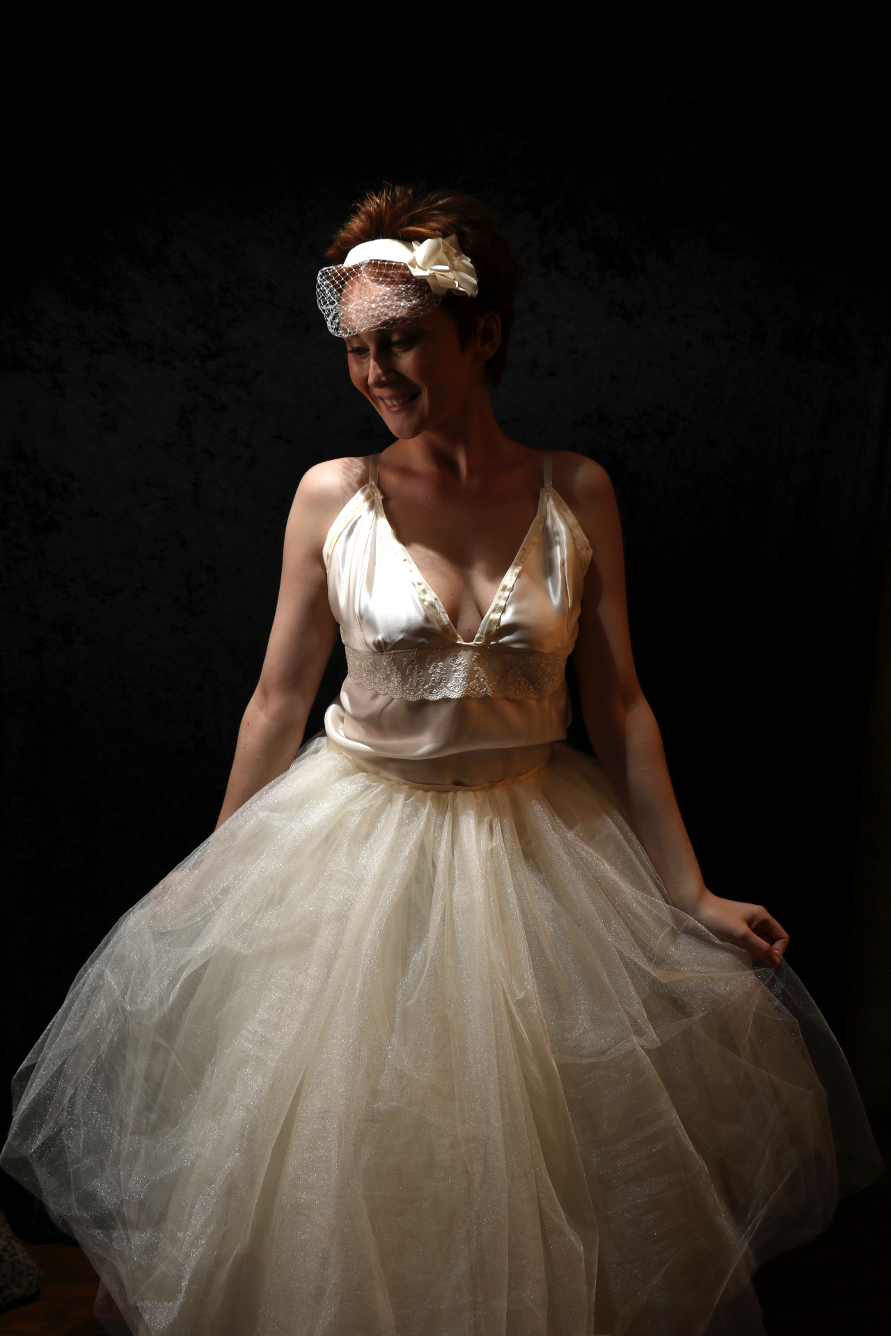 The top is made of 100% pure silk satin and crepe and fitted with netted cups and underwire as well as satin ribbon stretch straps for comfort and support. The embroidered lace at the under bust adds a very rustic and romantic feel, finished with a ribbon at the back concealing the adjustable hooks and eyes.