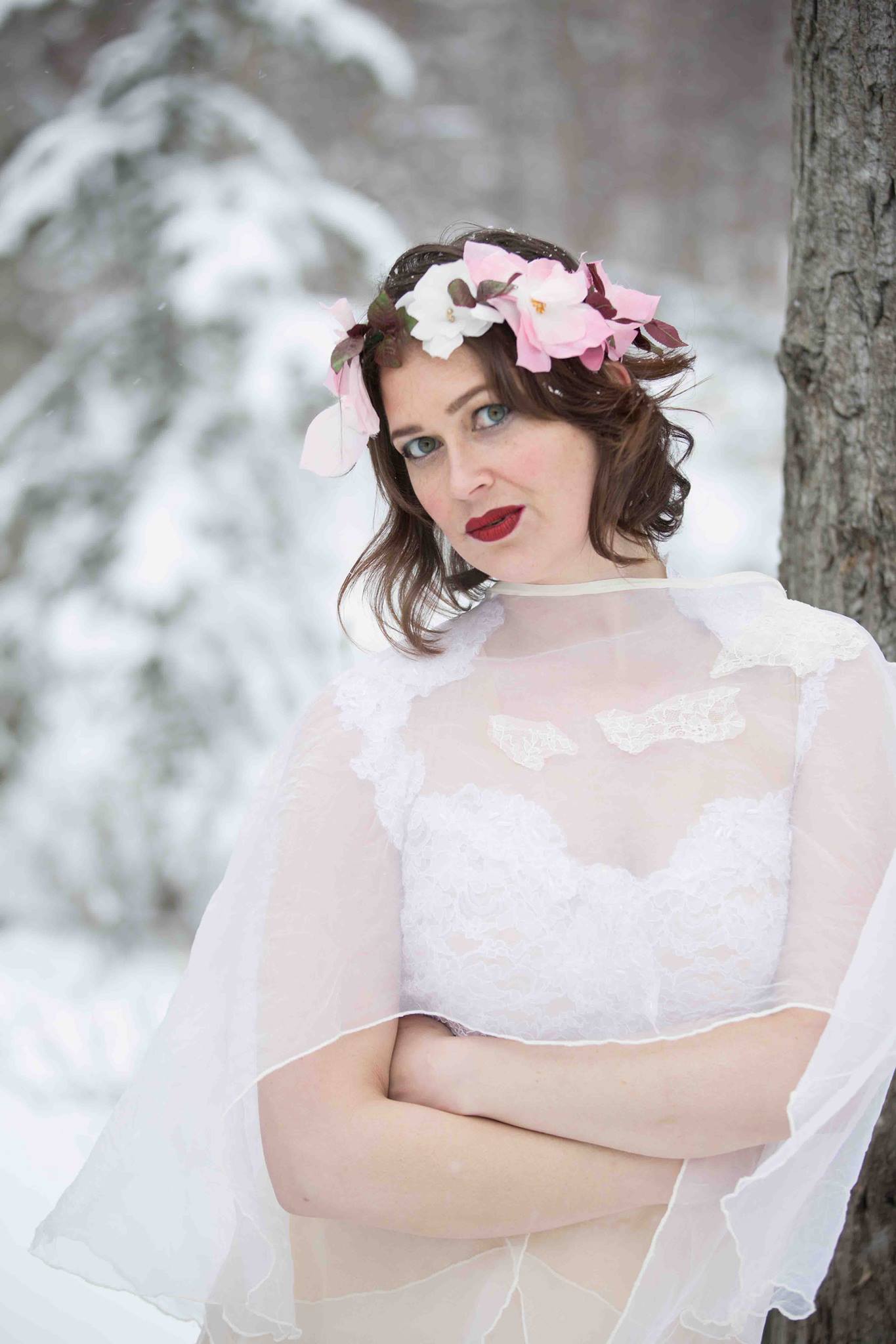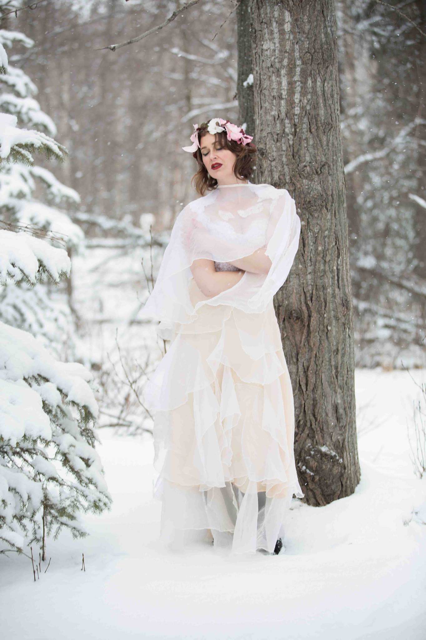 Gorgeously flowing, this silk organza and lace bridal cape-let is the perfect topper for a bohemian, rustic and ethereal bride. Made of hand-dyed silk organza with hand-cut French Chantilly lace accents and secured in the back by a satin ribbon tie. The cape-let is made just to the elbows in the front and hangs down to the top of the thighs in the back.