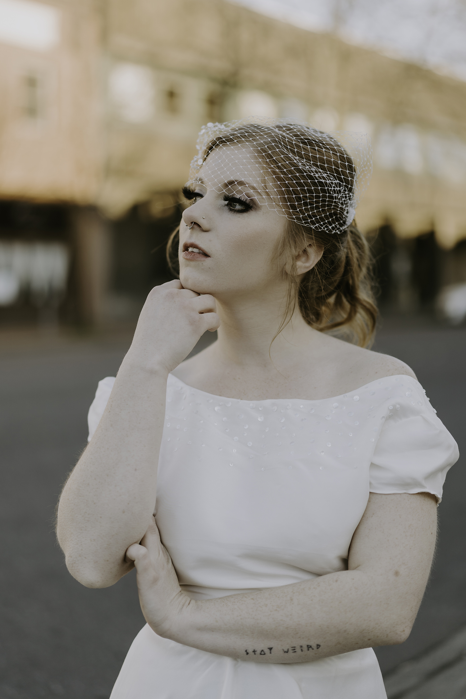 Our Stella gown is perfect for a fashion-forward bride. With a hi-low skirt and hand-embellished bodice, it sparkles like a star. The fair-trade Dupionni silk flows dreamily at the skirt and and has beautiful structure at the top. The sequins catch the light brilliantly and are reminiscent of fresh water pearls.