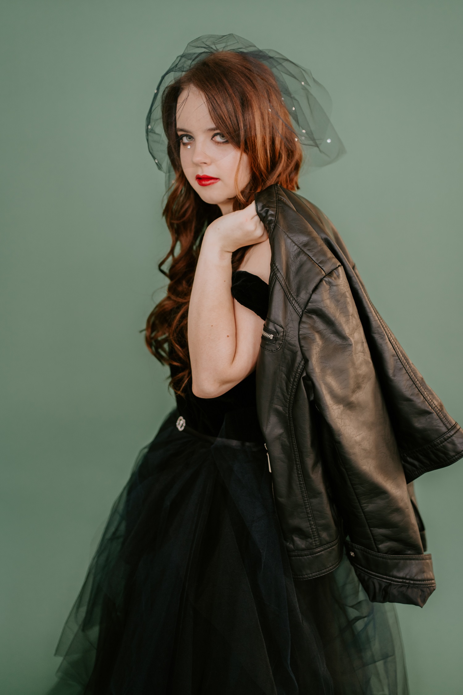 Our Vixen gown is Rock 'n' Roll ready with 1950s inspired off-shoulder sleeves, a sumptuous velvet bodice, beaded tulle over silk crepe skirt and rhinestone belt accent. Made from fair-trade silk crepe, the skirt is hi-low, just below the knee at front and a chapel length train at the back. The silk and rayon velvet bodice is adorned with a satin ribbon belt with rhinestone buckle. Fully lined in Kona cotton (made in the USA).