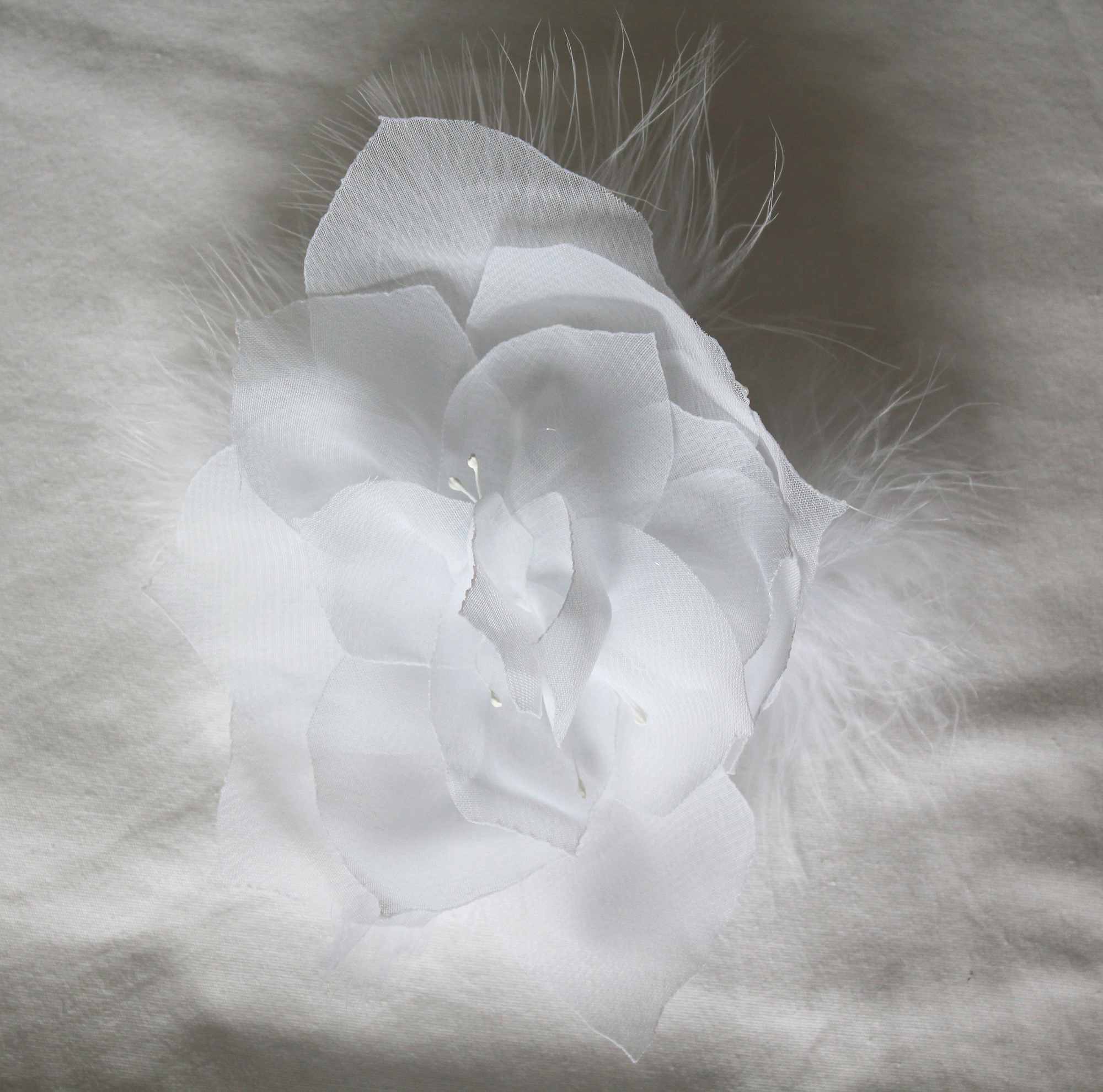 Soft, billowy chiffon is hand cut and crafted to created the petals of this dream-like tropical-inspired lily. Delicate matte white stamens peaked out from the center of the blossom and whisky ostrich feathers add an ethereal finishing touch.